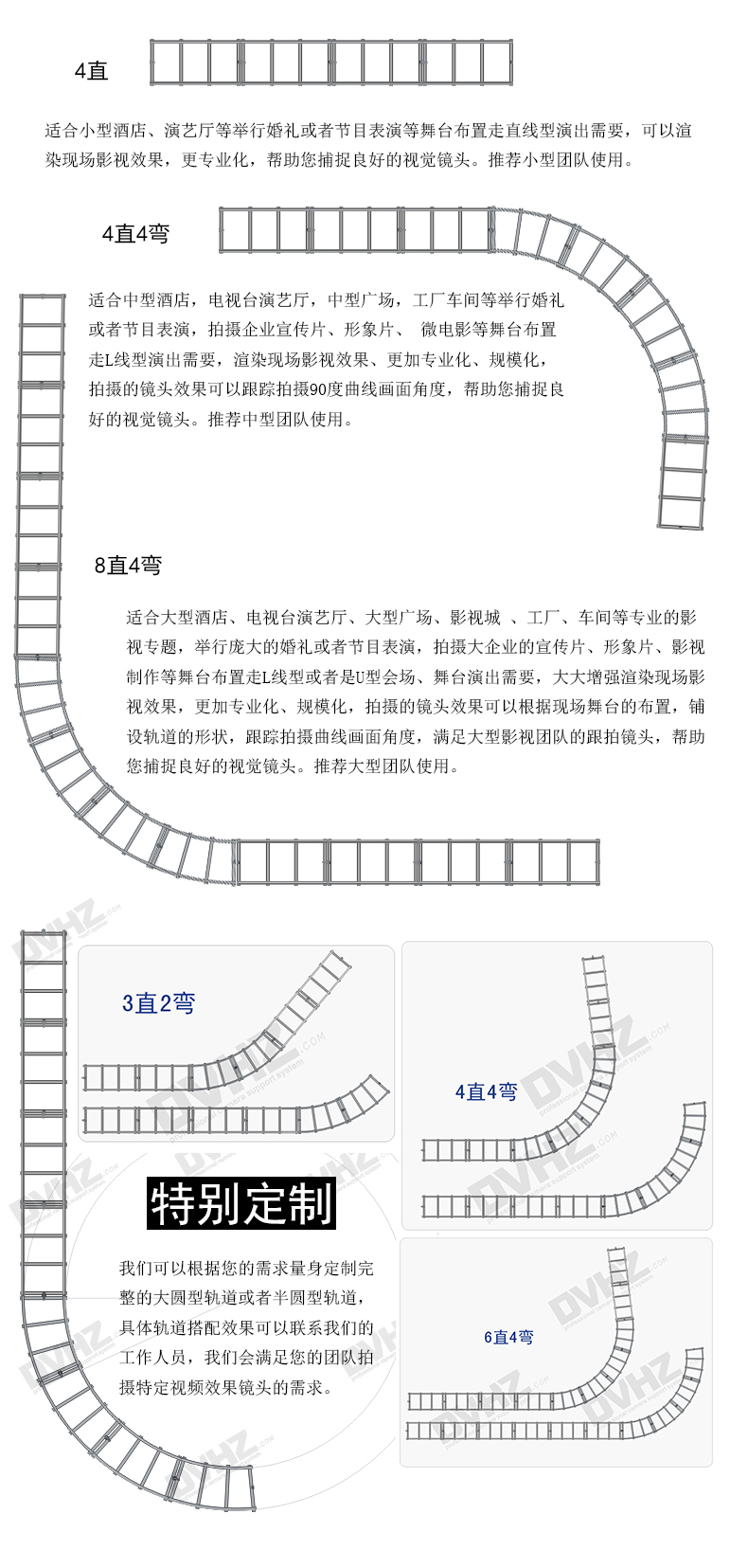 全套导轨采用高强度优质工业不锈钢管精制而成,每节直、弯轨道可任意拆装组合,接缝紧密。方便、牢固、易拆装可作同期声移动轨使用。拍电影、电视节目、摄影棚等內外景拍摄必备工具。