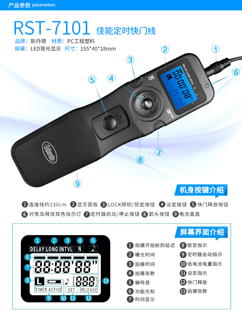 商品名称:斯丹德 5D3/2单反6D相机70D700Dfor宾得定时佳能索尼延时60D快门线 RST-7101