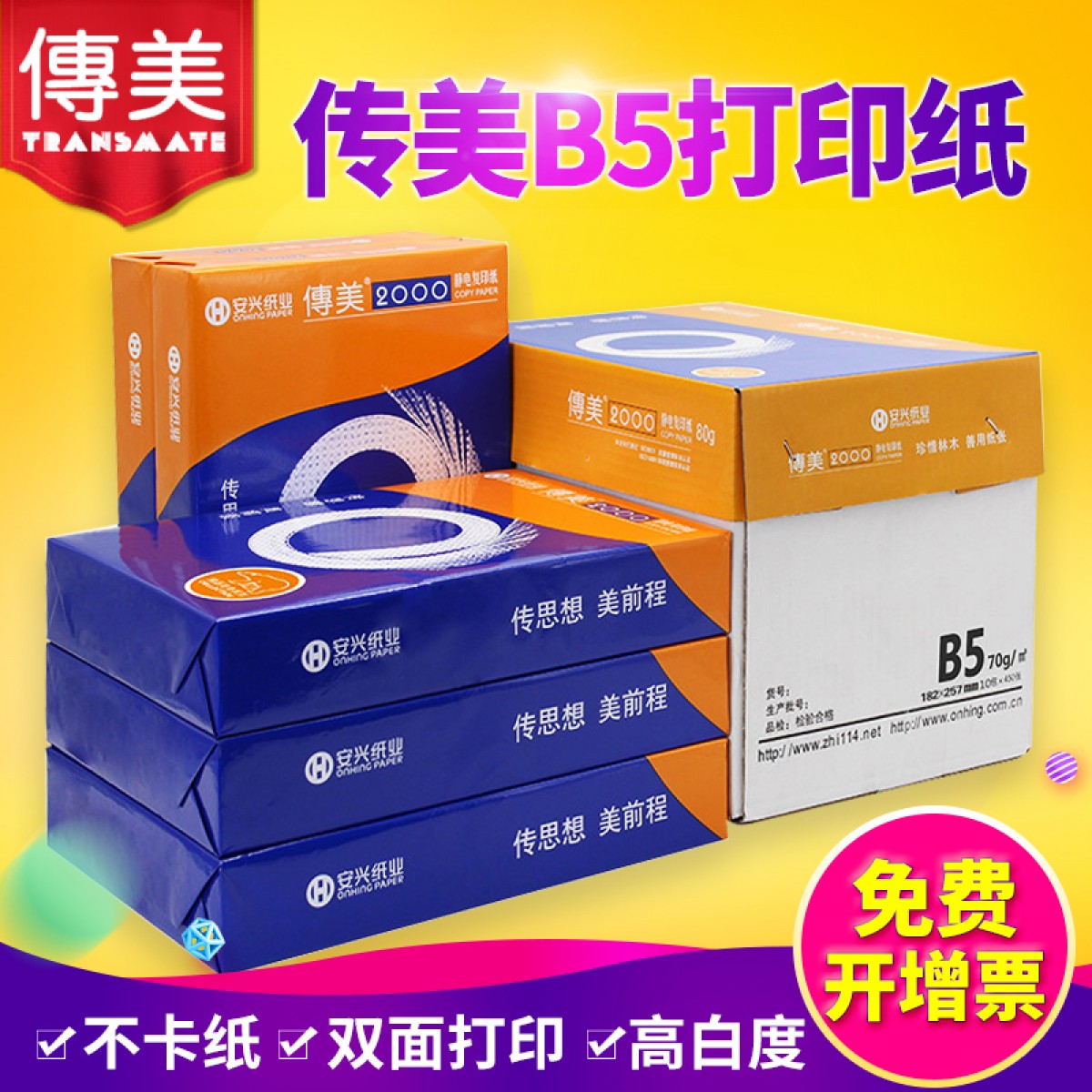 安兴纸业 传美 182mm*257mm复印纸B5打印白纸70g单包500张b5整箱批发80g