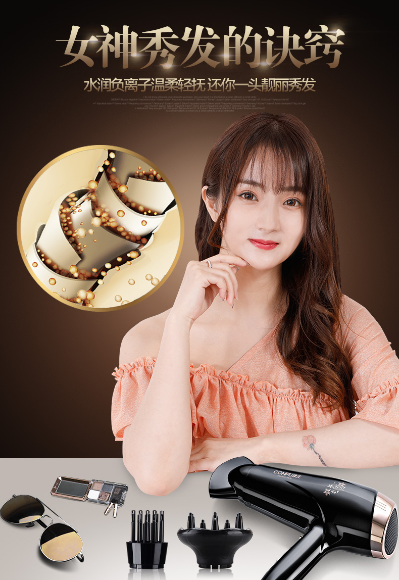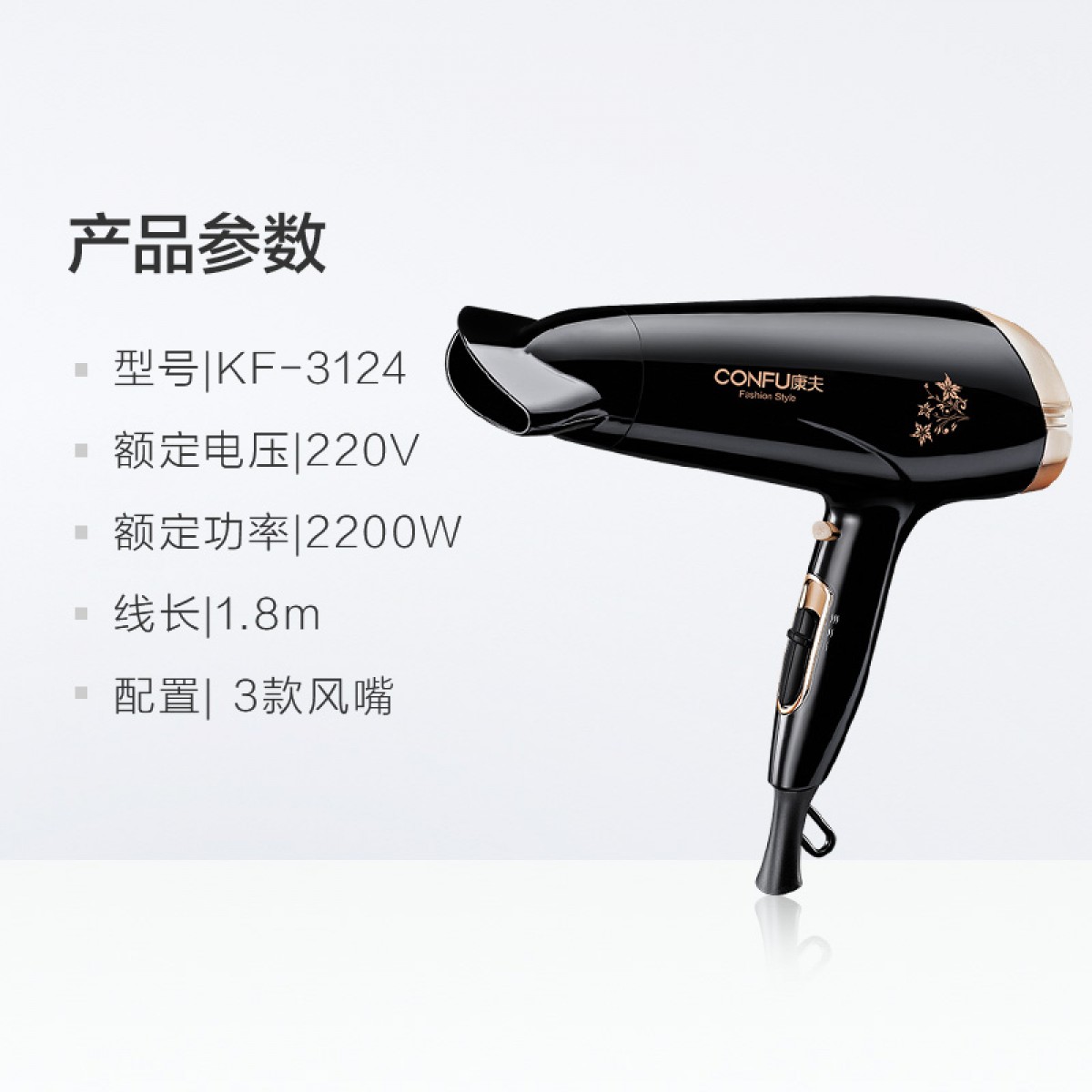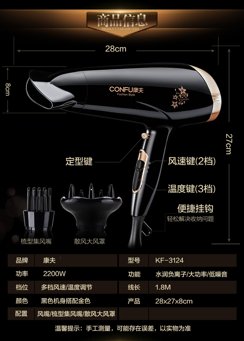 商品名称:康夫 电吹风大功率负离子吹风机不伤发家用吹风筒学生宿舍KF3124