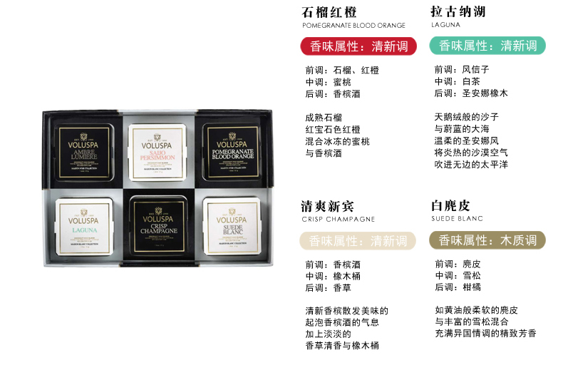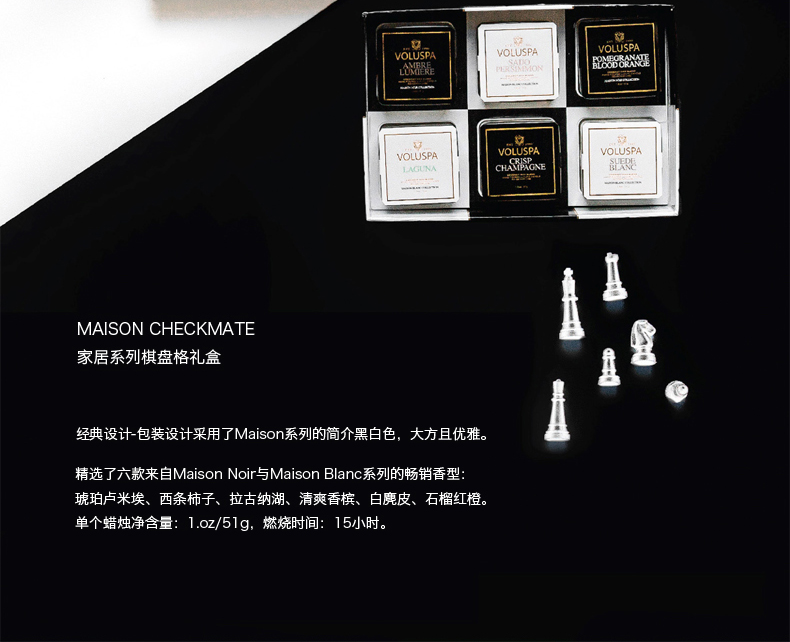 商品名称:VOLUSPA Maison黑白家居系列-6只装棋盘格礼盒 香薰蜡烛