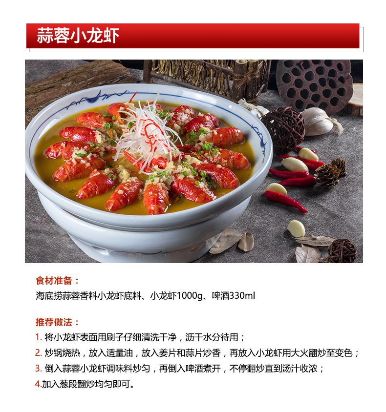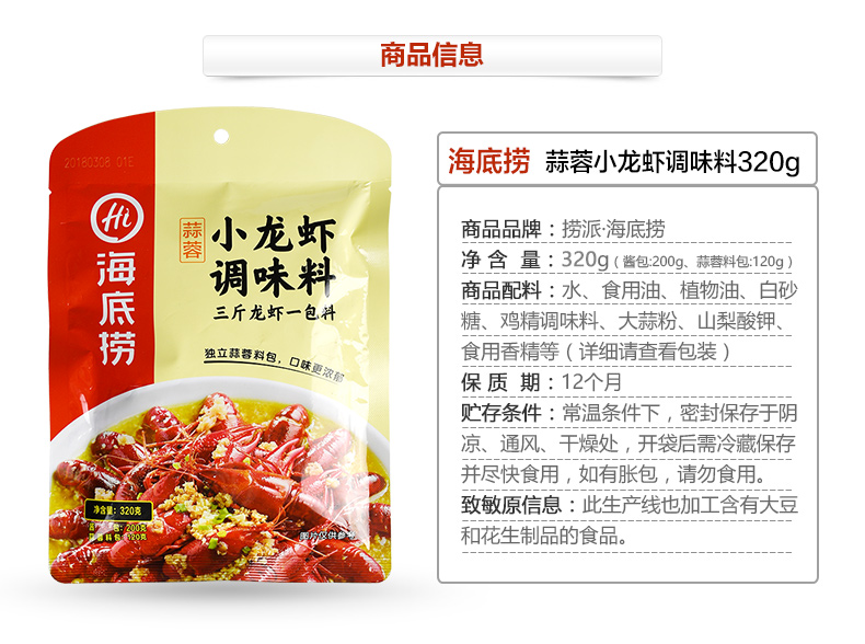 商品名称:海底捞 调味料 蒜蓉小龙虾调味料320g*5包 油焖花甲基围虾调料