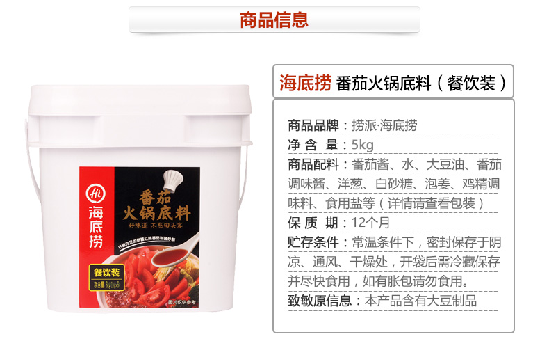 商品名称:海底捞 番茄火锅底料5KG桶装餐饮装 捞派四川火锅调味料汤料