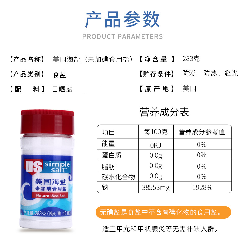 商品名称:粤盐牌 283克 未加碘 美国海盐 高端进口调料盐