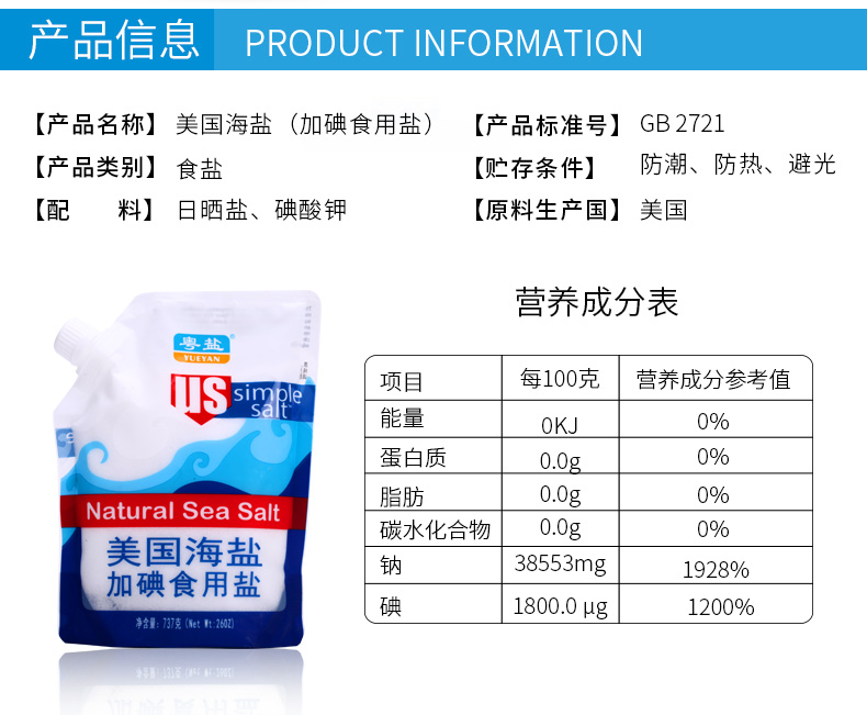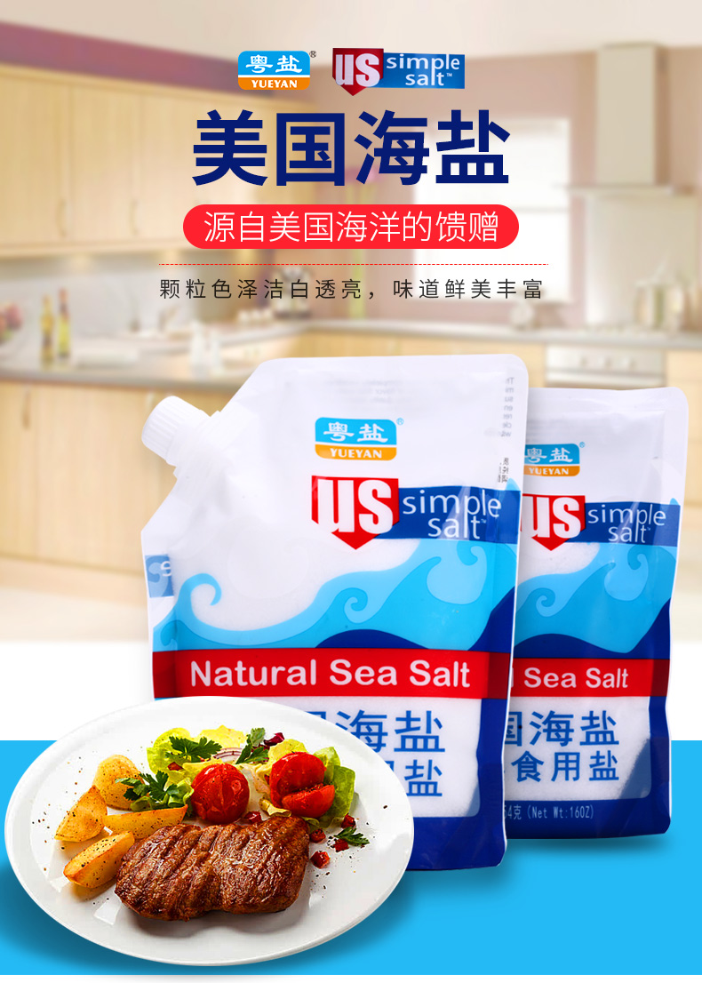 商品名称:粤盐牌 454克 加碘 美国海盐 高端进口调料盐