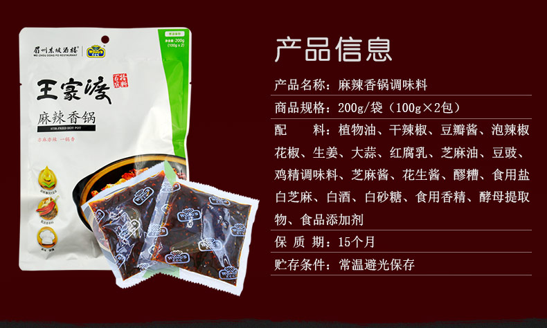 商品名称:王家渡 麻辣香锅底料200g 四川正宗火锅麻辣烫干锅调味料百搭底料