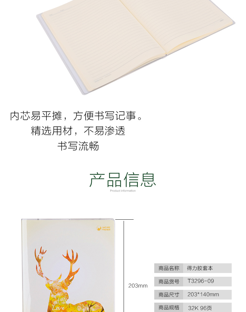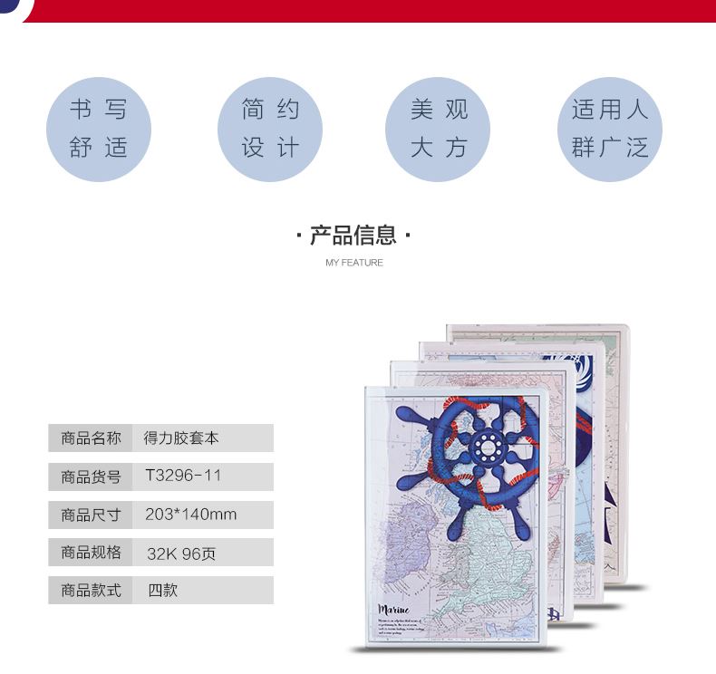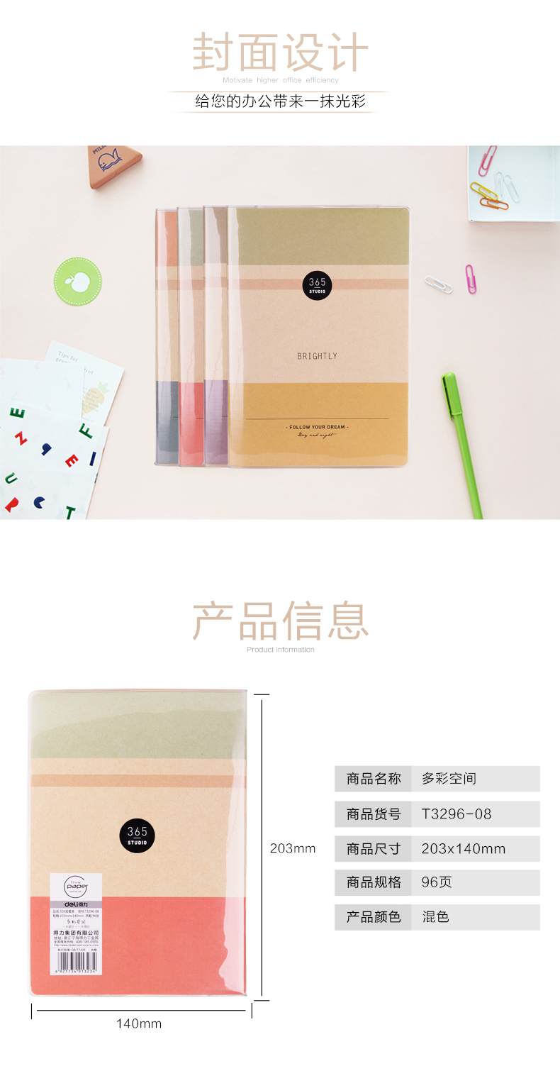 商品名称:得力 T3296-08/09/10/11胶套本笔记本学生办公胶套本96页203*140mm