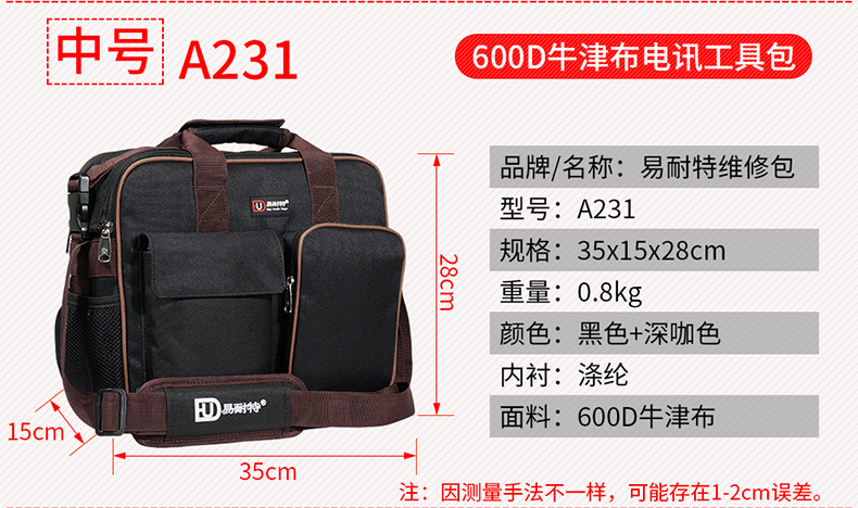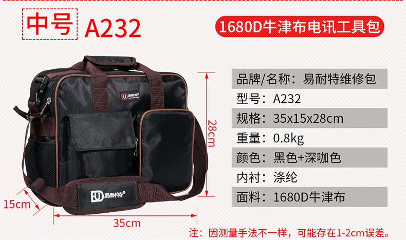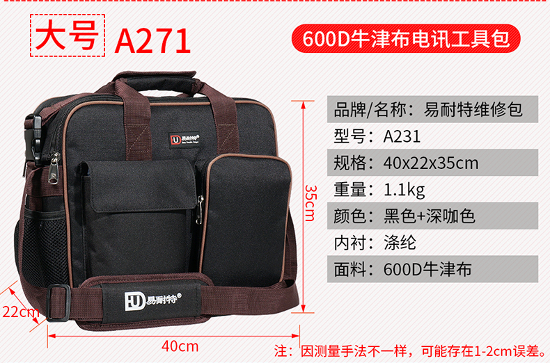 商品名称:易耐特 工具包维修电脑包多功能电工工具包 小号 A231