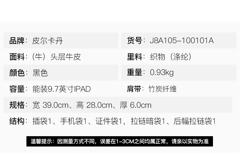 商品名称:皮尔卡丹 手提包真皮单肩斜挎包 J8A105-100101A