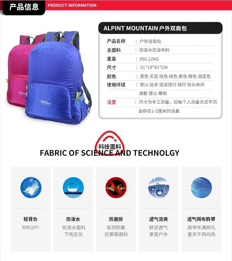 商品名称:埃尔蒙特 皮肤包轻便户外双肩背包登山背包 630-726