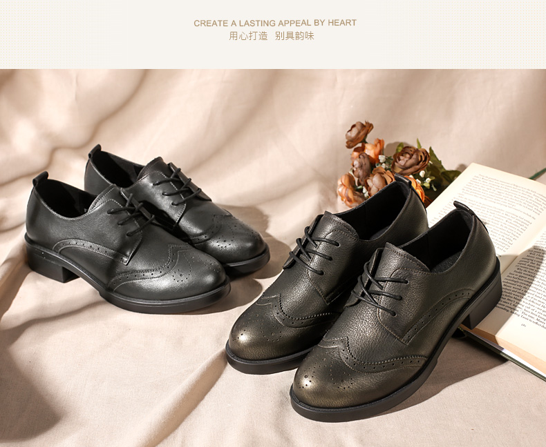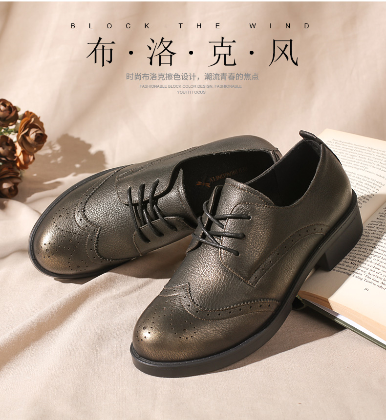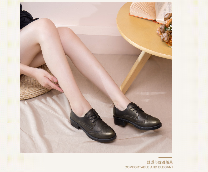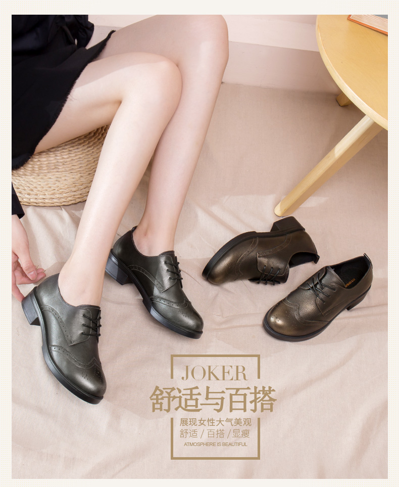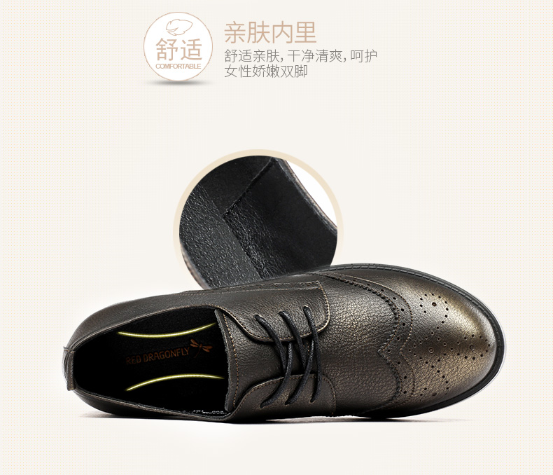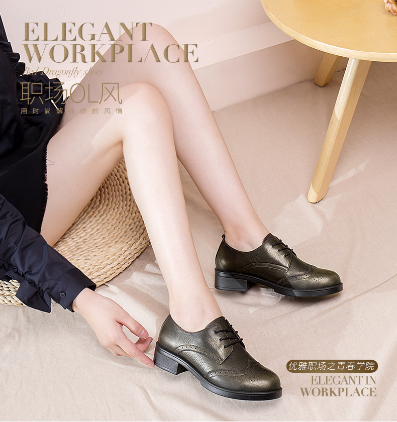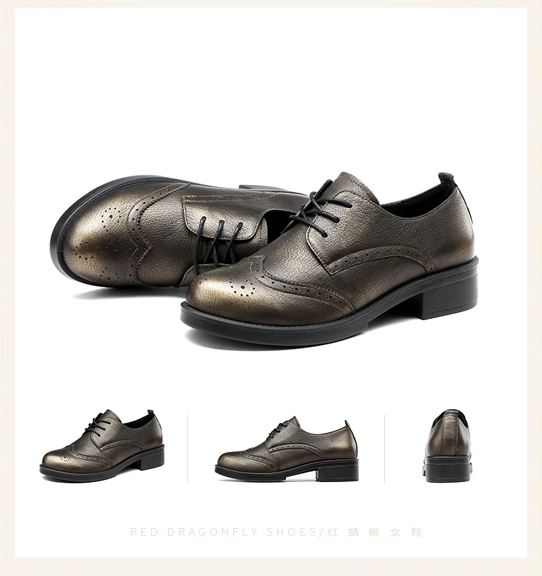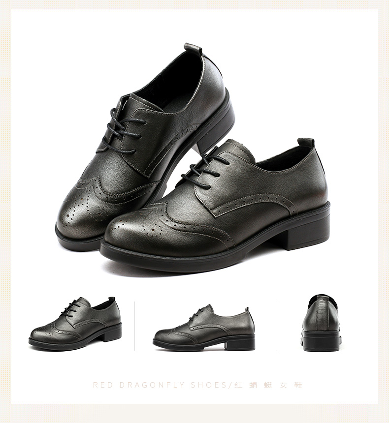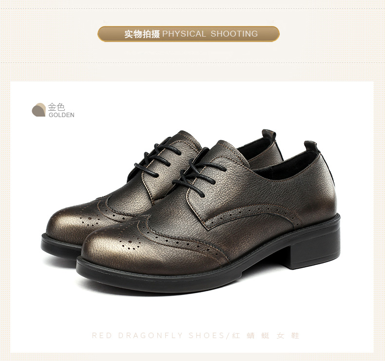 商品名称:红蜻蜓 真皮女单鞋春秋布洛克休闲粗跟女鞋皮鞋