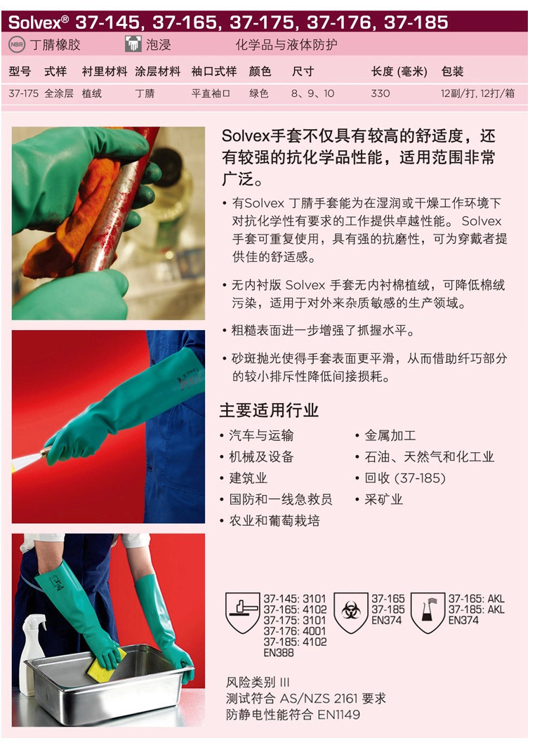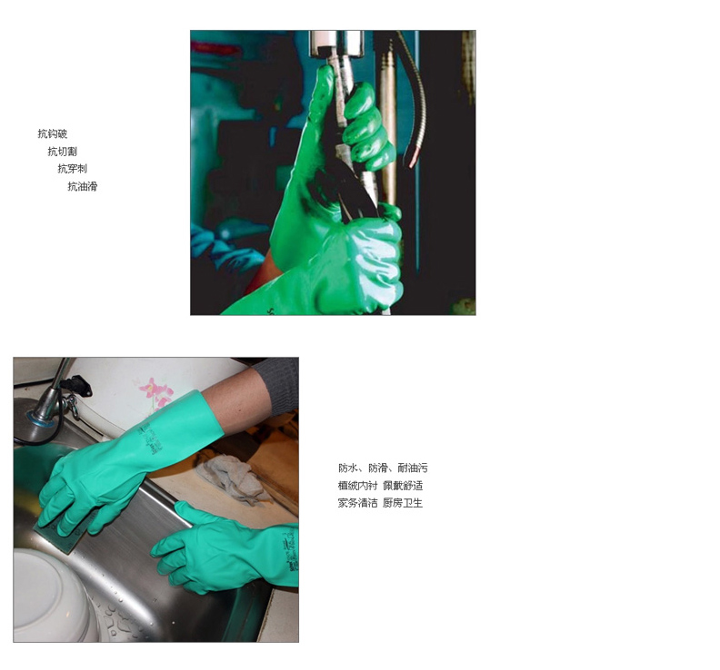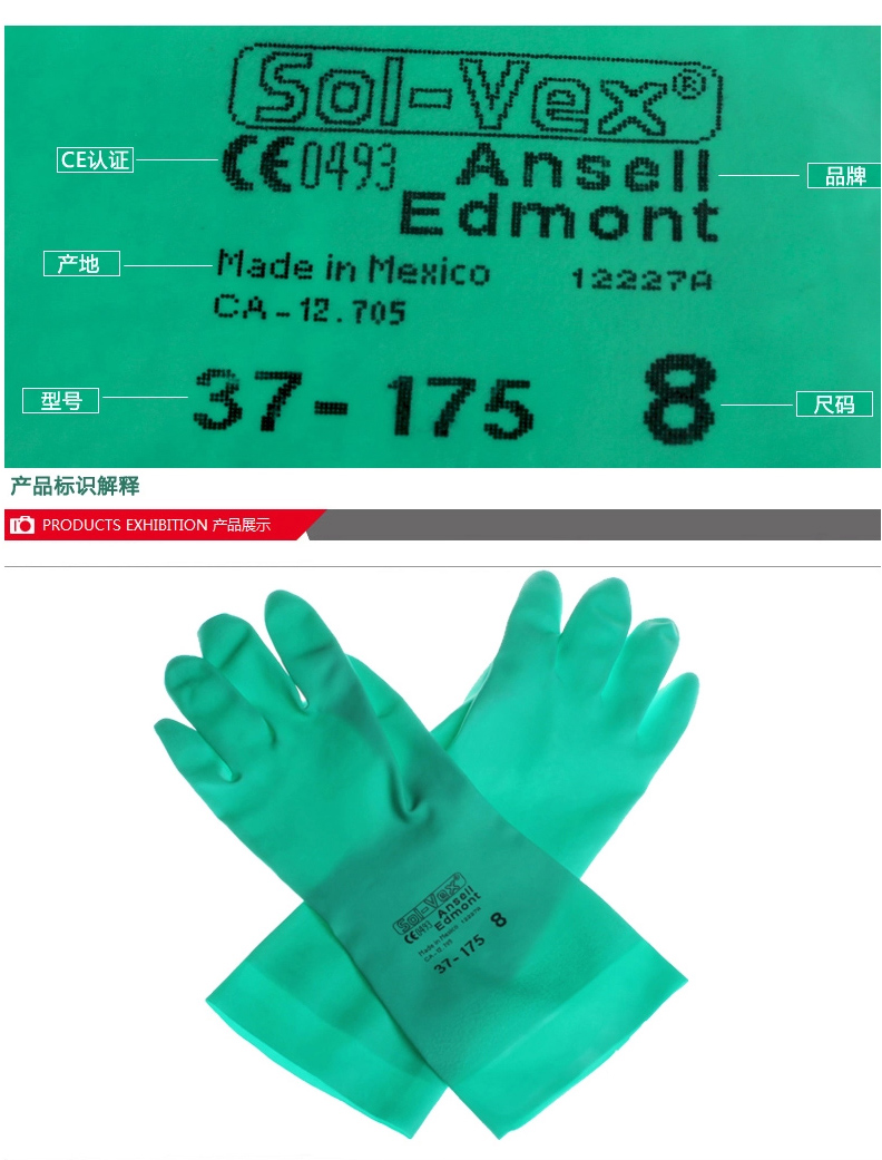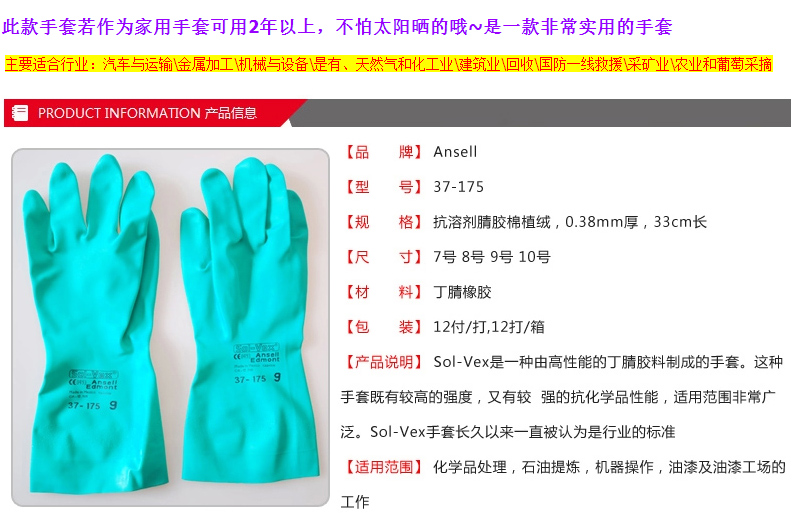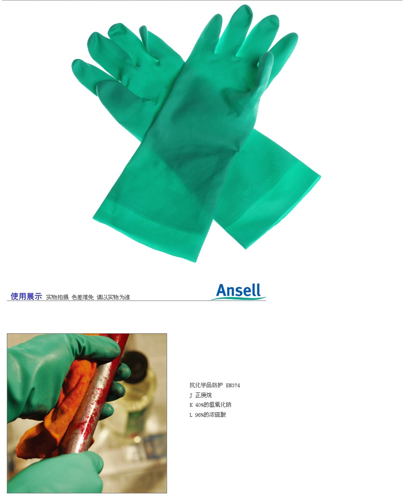 商品名称:Ansell/安思尔 37-175 加厚手套防水防化手套耐磨耐酸碱劳保手套