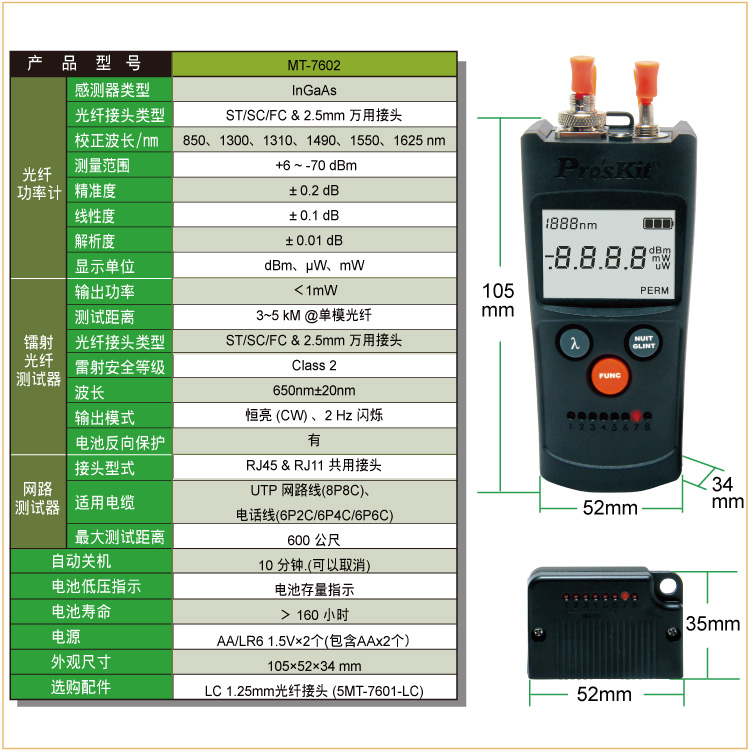 MT-7602 4合1光纤功率计/可视故障探测仪/网线测试器/LED手电