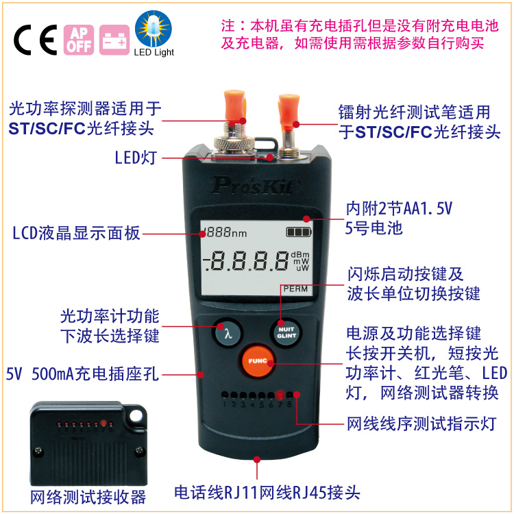 6种波长光纤光源损耗测试 850/1300/1310/1490/ 1550/1625nm 供率测量单位选择: dBm,mW , uM 支援2.5mm 万用光纤接头(ST/SC/FC)