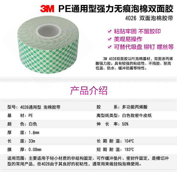 商品名称:3M 聚氨脂泡棉双面胶带 家具 办公 汽车粘胶 厚度1.6毫米 4026