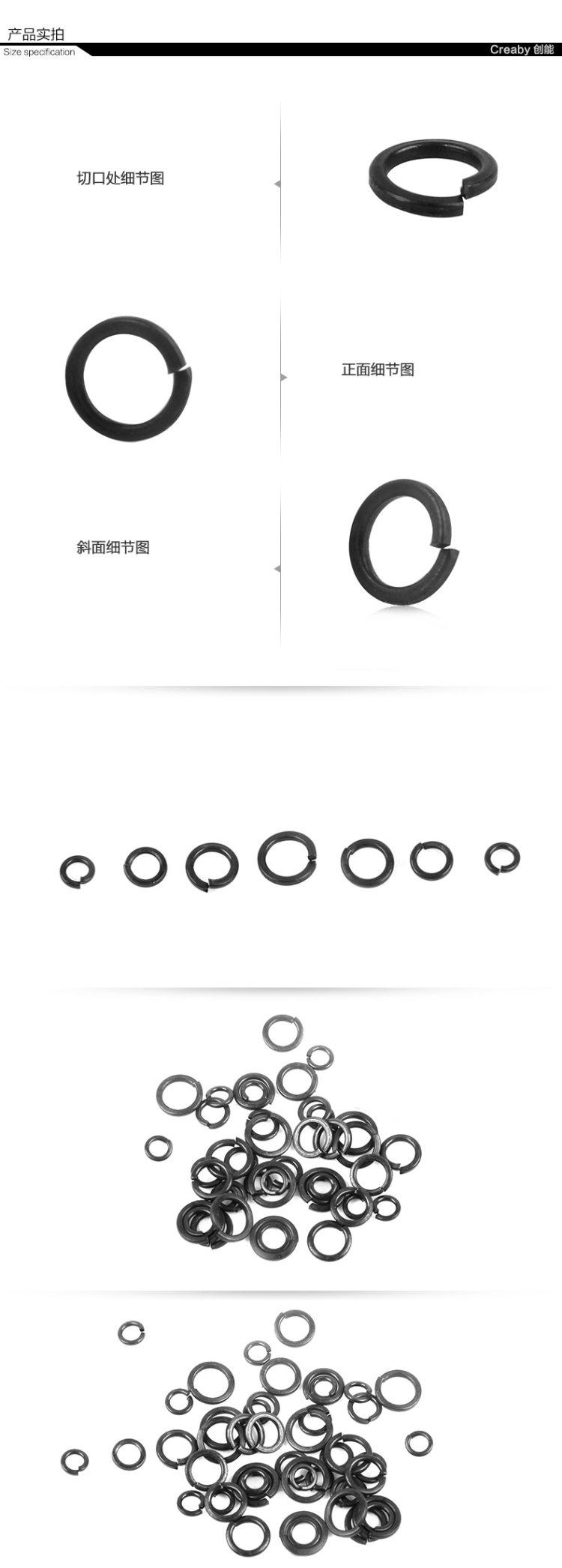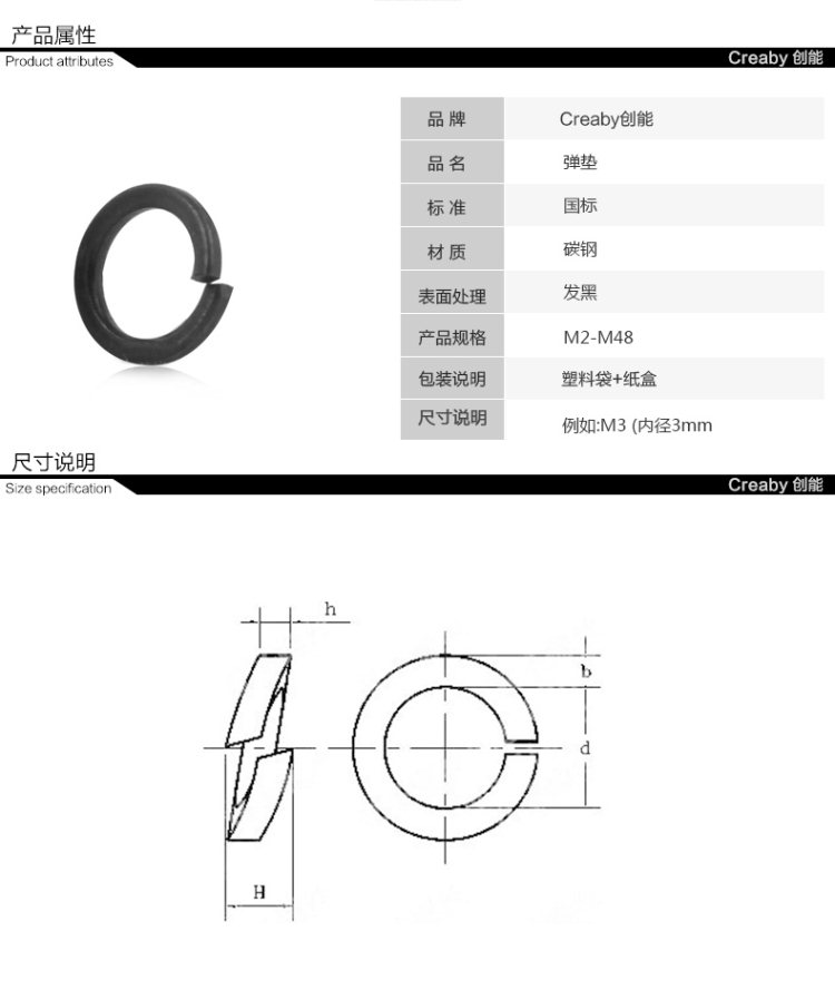 商品名称:Creaby/创能 8.8级 弹垫 加宽弹簧垫圈华司螺丝垫片 发黑开口加厚 M3-M30