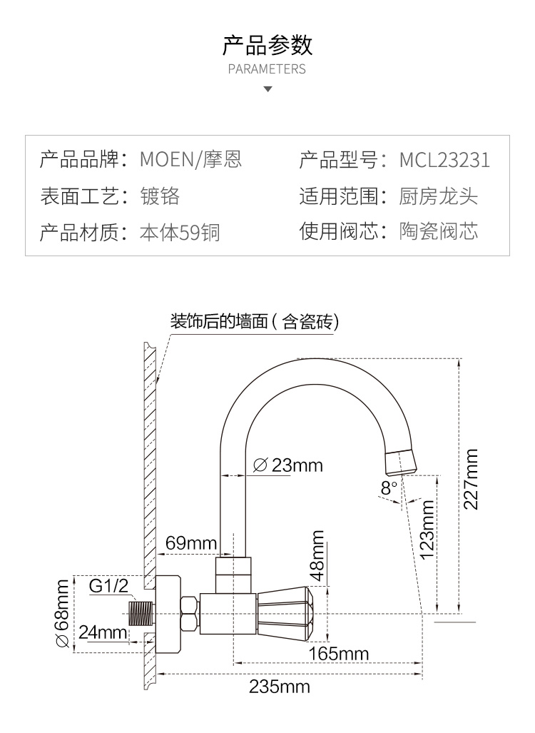 商品名称:摩恩 入墙式水龙头冷热厨房龙头洗菜盆洗碗池水槽龙头全铜 MCL23231