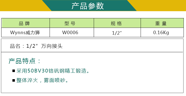 商品名称:Wynn's/威力狮 1/2”铬钒钢万向接头 喷砂套筒转接头 W0006