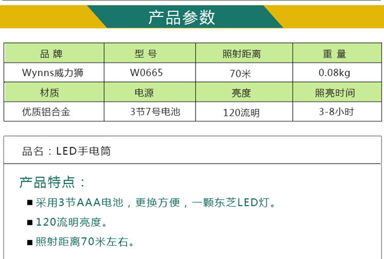 商品名称:Wynn's/威力狮 LED电筒 LED手电筒 小手电 小手电筒 W0665