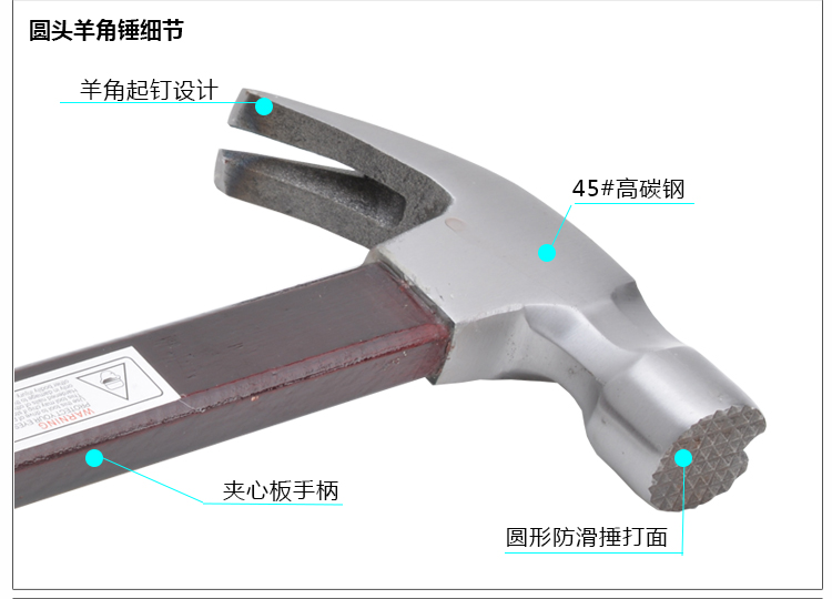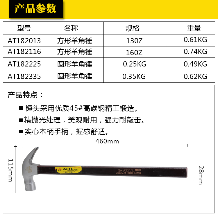 商品名称:Aotl/澳特利 木柄羊角锤 方形羊角铁锤 榔头 圆形铁锤 起钉锤 AT182
