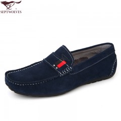 七匹狼 男鞋头层牛皮男士时尚潮流日常休闲套脚蓝色真皮皮鞋子