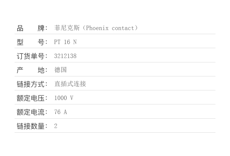 商品名称:菲尼克斯 接线端子直插式连接16 平方 PT 16 N-3212138