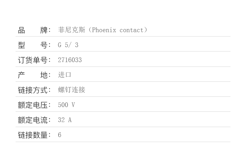 商品名称:菲尼克斯 设备端子螺钉连接4 平方 G 5/ 3-2716033