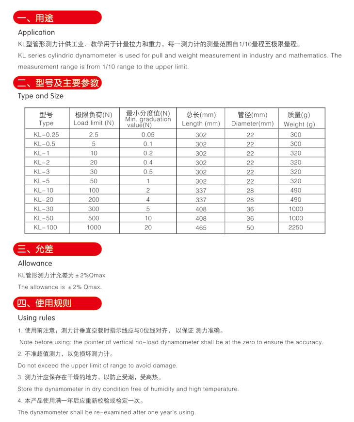商品名称:无锡大箕山 象牌KL系列管形测力计 5N测力计 拉力棒 KL-0.5