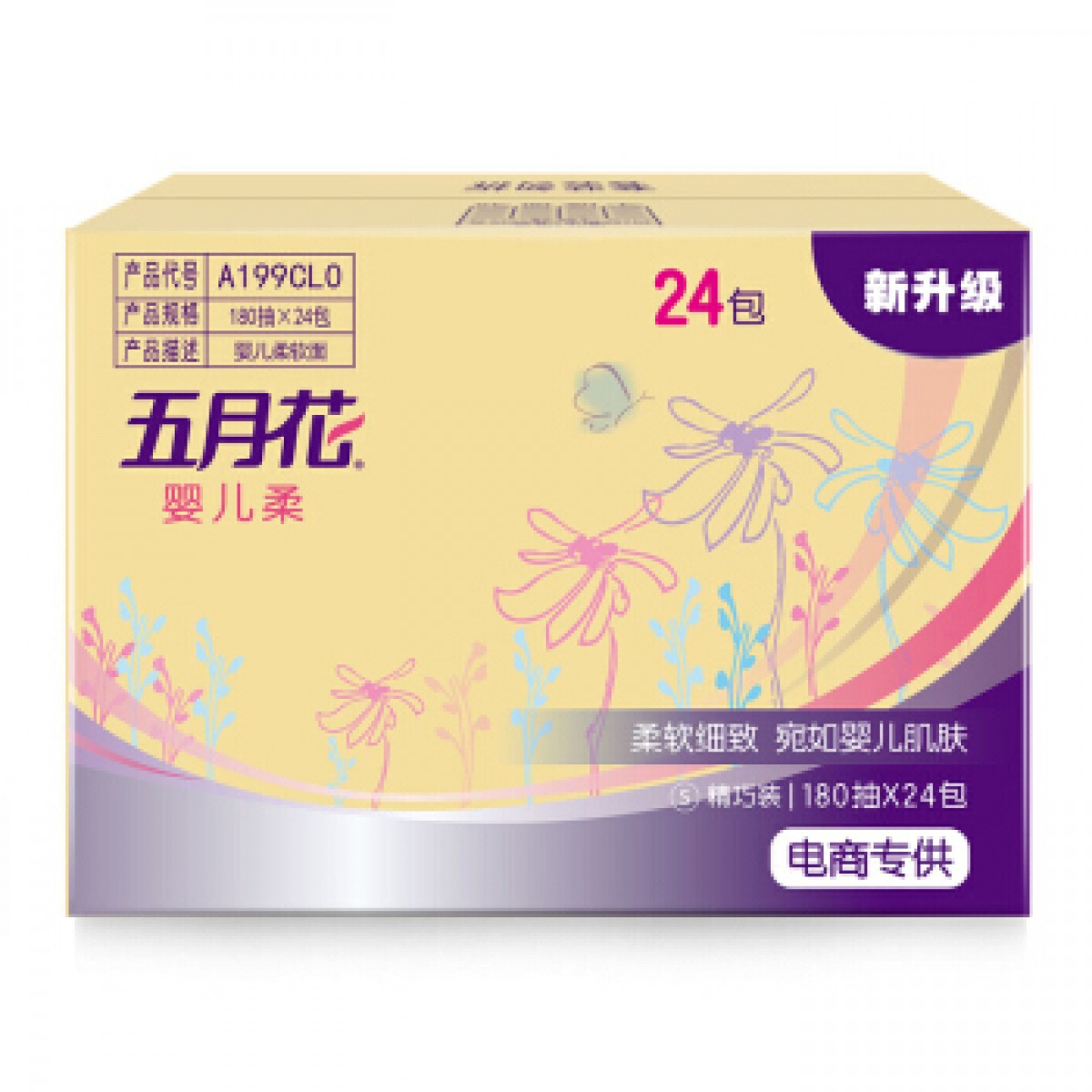 商品名称:五月花 抽纸 婴儿柔2层180抽面巾纸*24包S码抽取式餐巾纸面纸