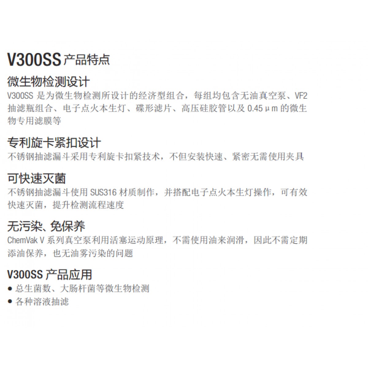真空抽滤被广泛地应用在实验室,包括食品、药品、饮品以及饮用水工业各种微生物测试,环境保护领域中的悬浮固形物(Suspended Solid)测定以及HPLC、GC、AA等微量分析的样品前处理或溶剂纯化。
