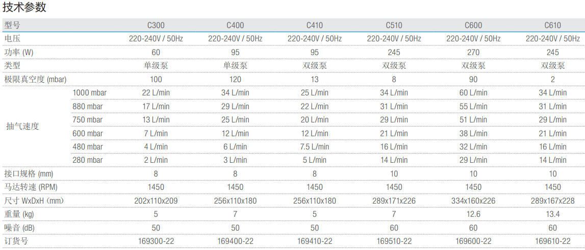 主要参数:极限真空度: 8mbar, 抽气速度:34 L/min ,额定功率:245W ,马达转速:1450 RPM。
