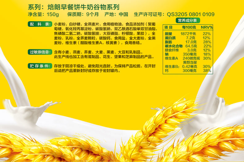 商品名称:焙朗 早餐饼酥性饼干牛奶谷物味150g 搭牛奶更佳谷物饼干