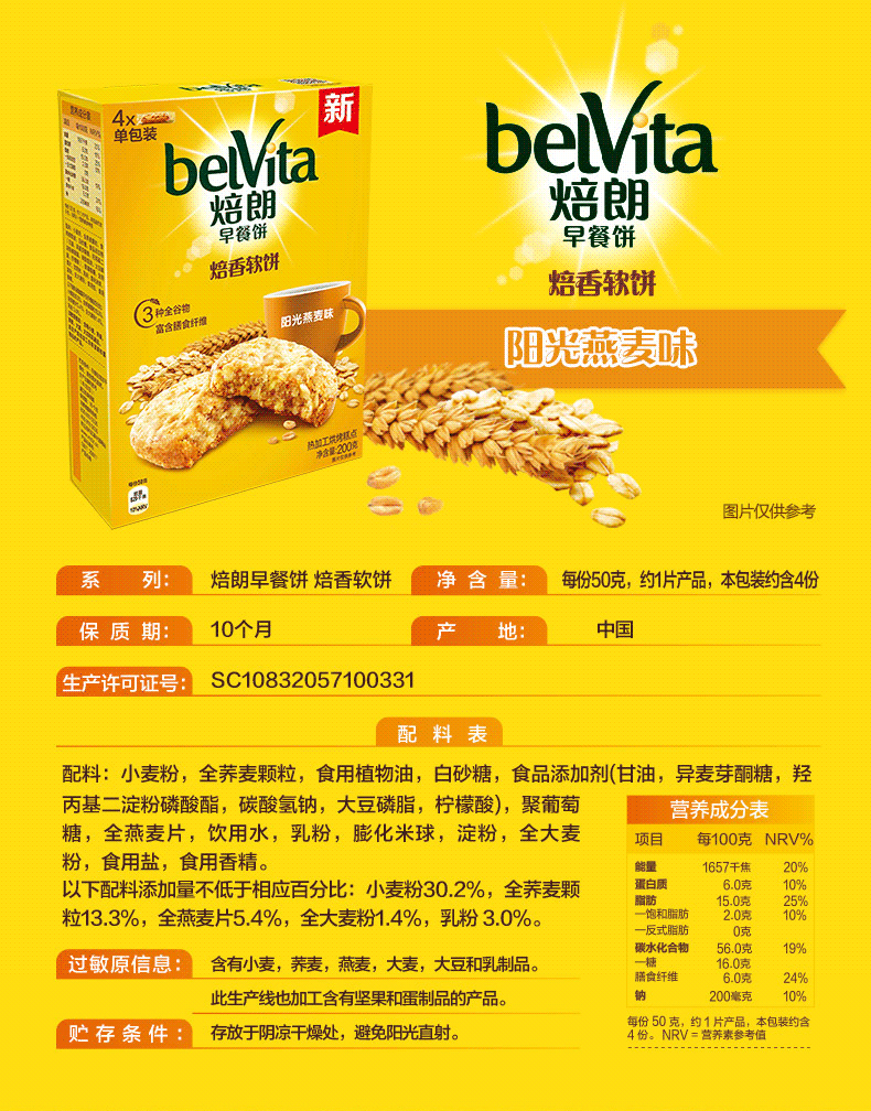 商品名称:焙朗 焙香软饼阳光燕麦味200g营养早餐饼 休闲零食 4小包装
