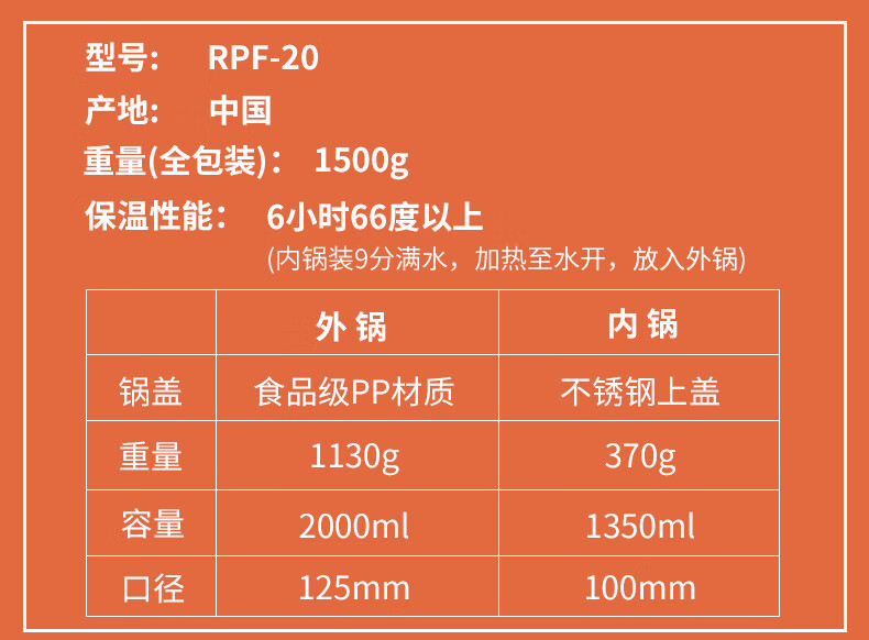 商品名称:膳魔师 真空不锈钢焖烧锅 双层家用保温锅保温壶炖汤RPF-20 1.5L