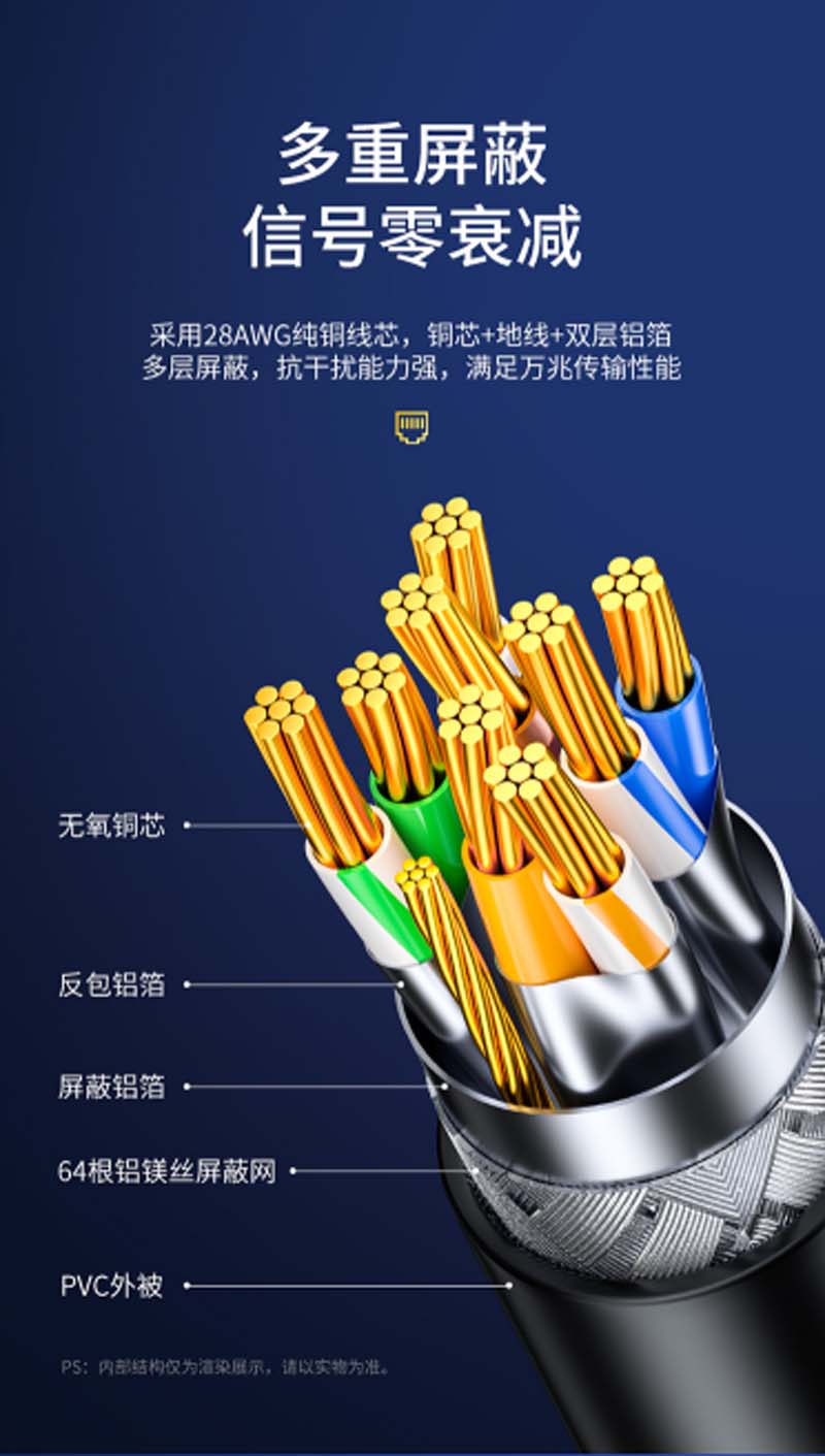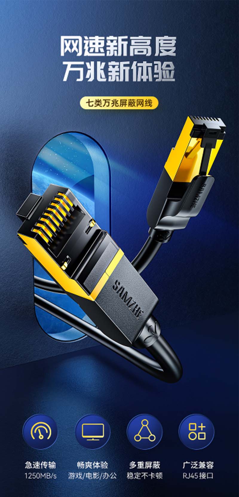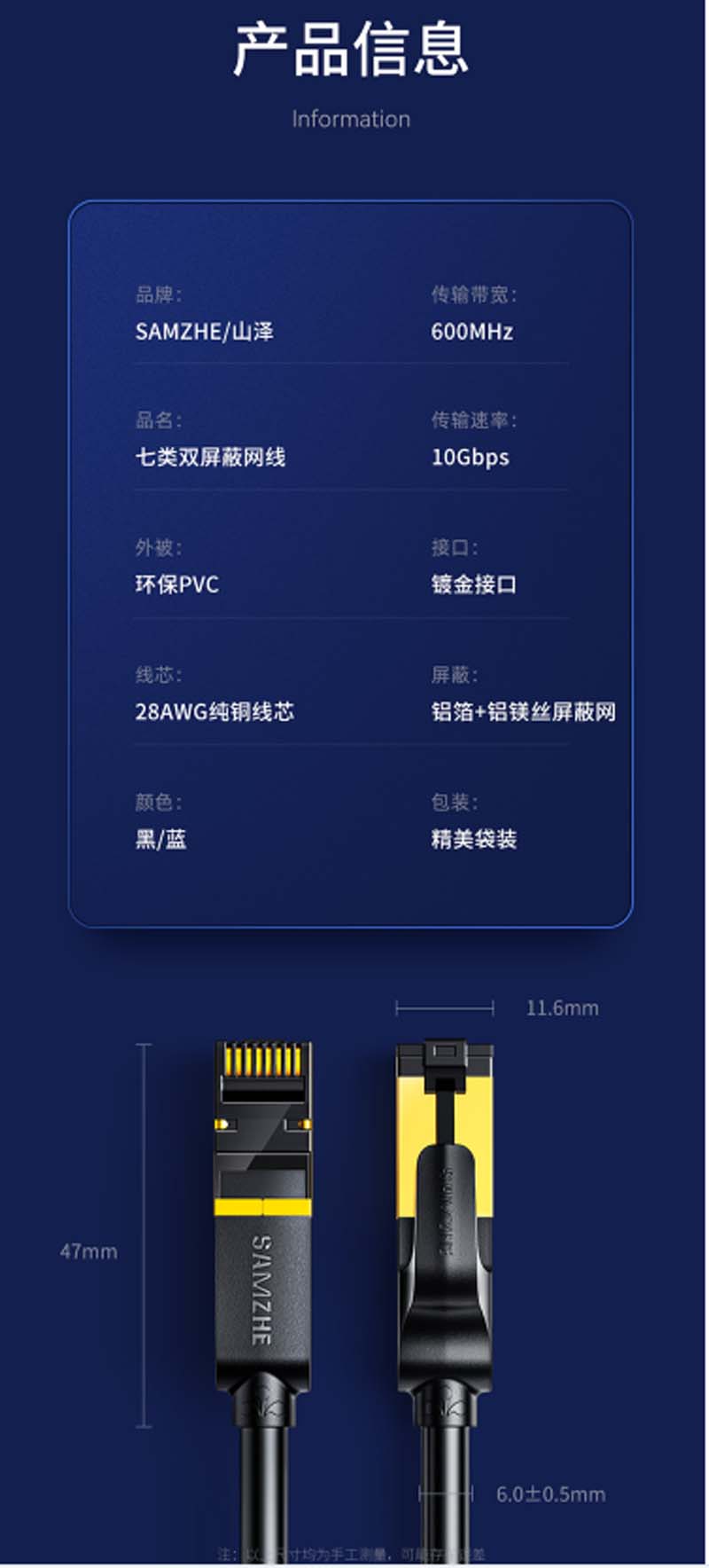 商品名称:☆山泽 SAMZHE CAT-7005H 工程级七类CAT7类纯铜镀金双屏蔽超高速网络跳线 成品网线 黑色0.5米