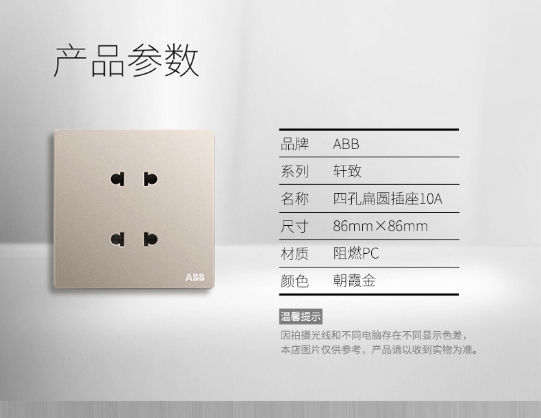 商品名称:ABB 开关插座无框轩致朝霞金墙壁插座面板四孔插座AF212-PG