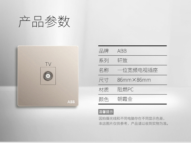 商品名称:ABB 开关插座无框轩致朝霞金墙壁插座面板宽频电视插座AF303-PG
