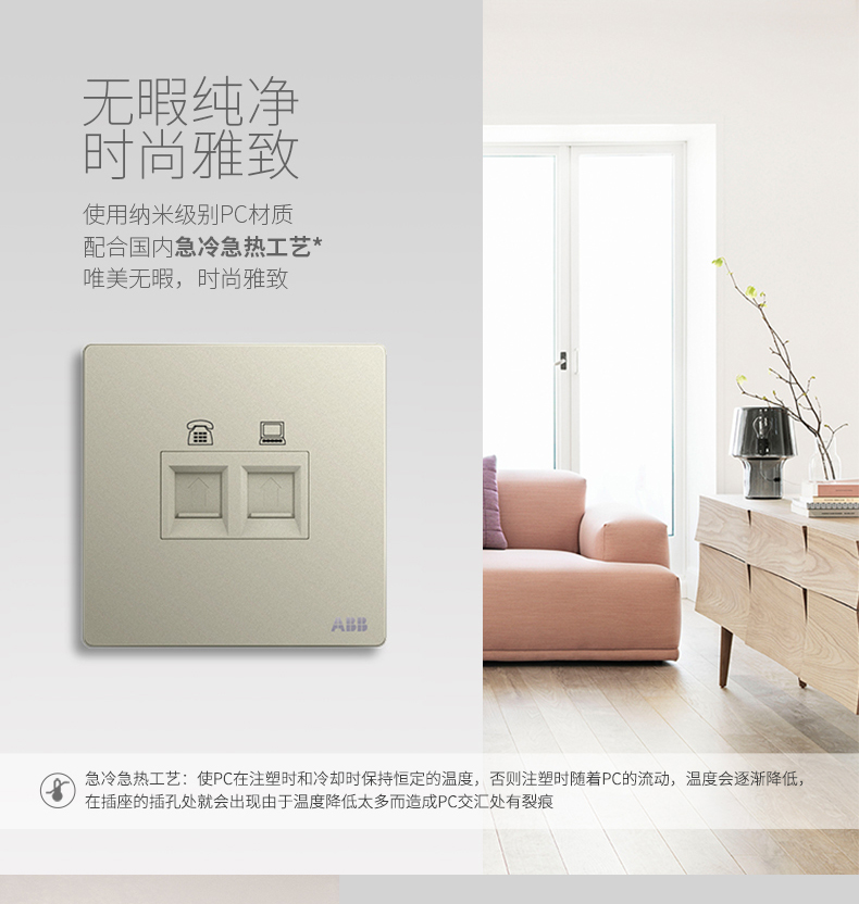 商品名称:ABB 开关插座轩致无框 香槟银 二位电话/六类电脑网络插座AF330-CS