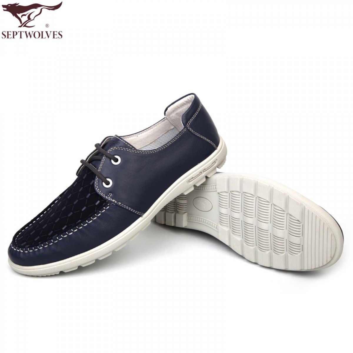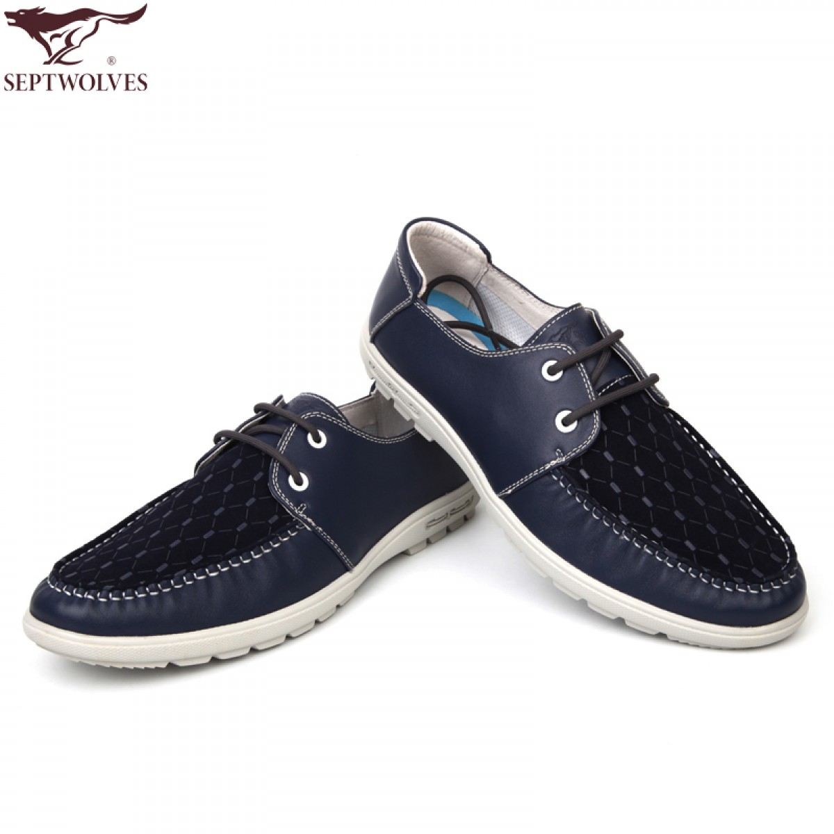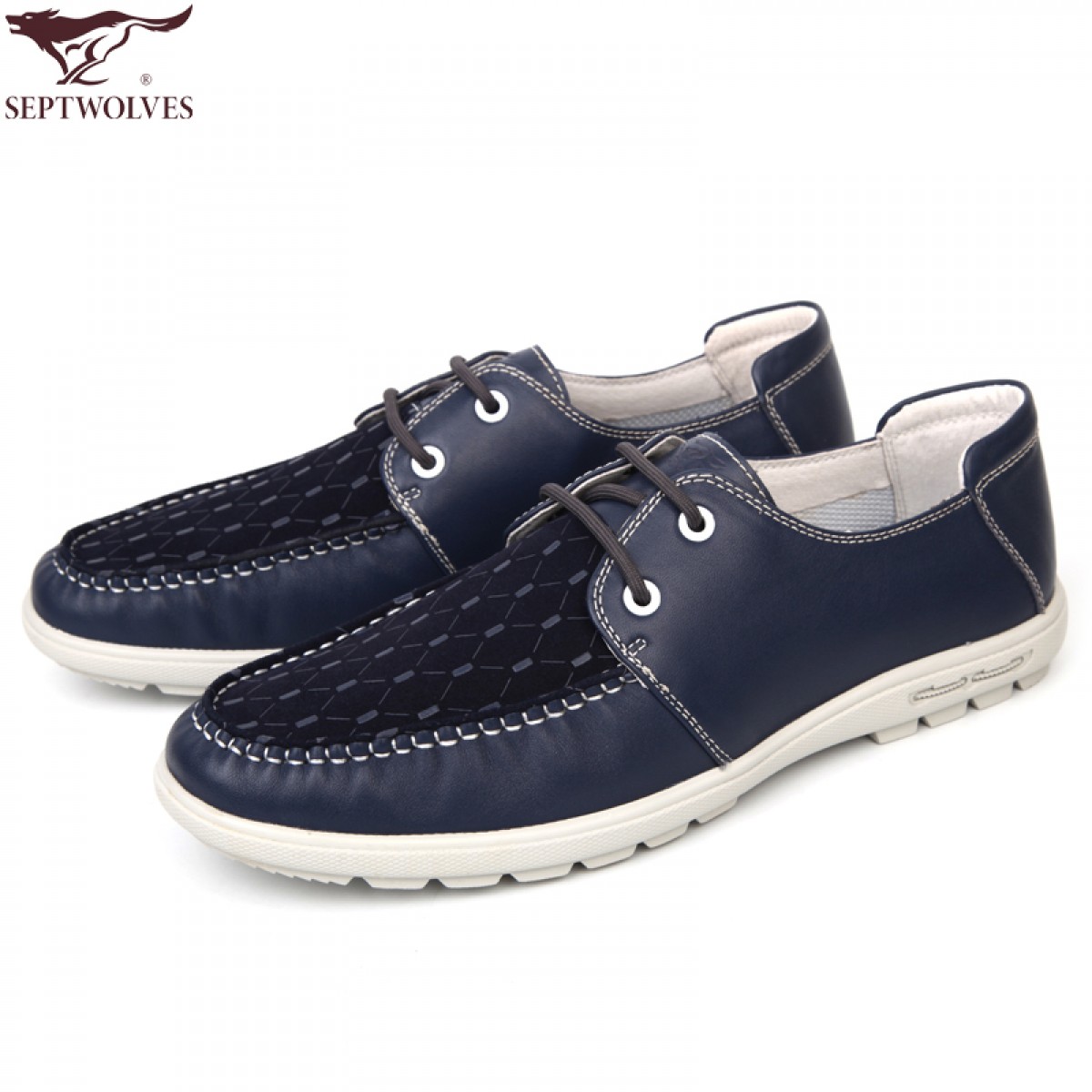 七匹狼 男鞋头层牛皮拼接男士时尚白底休闲蓝色系带真皮皮鞋子