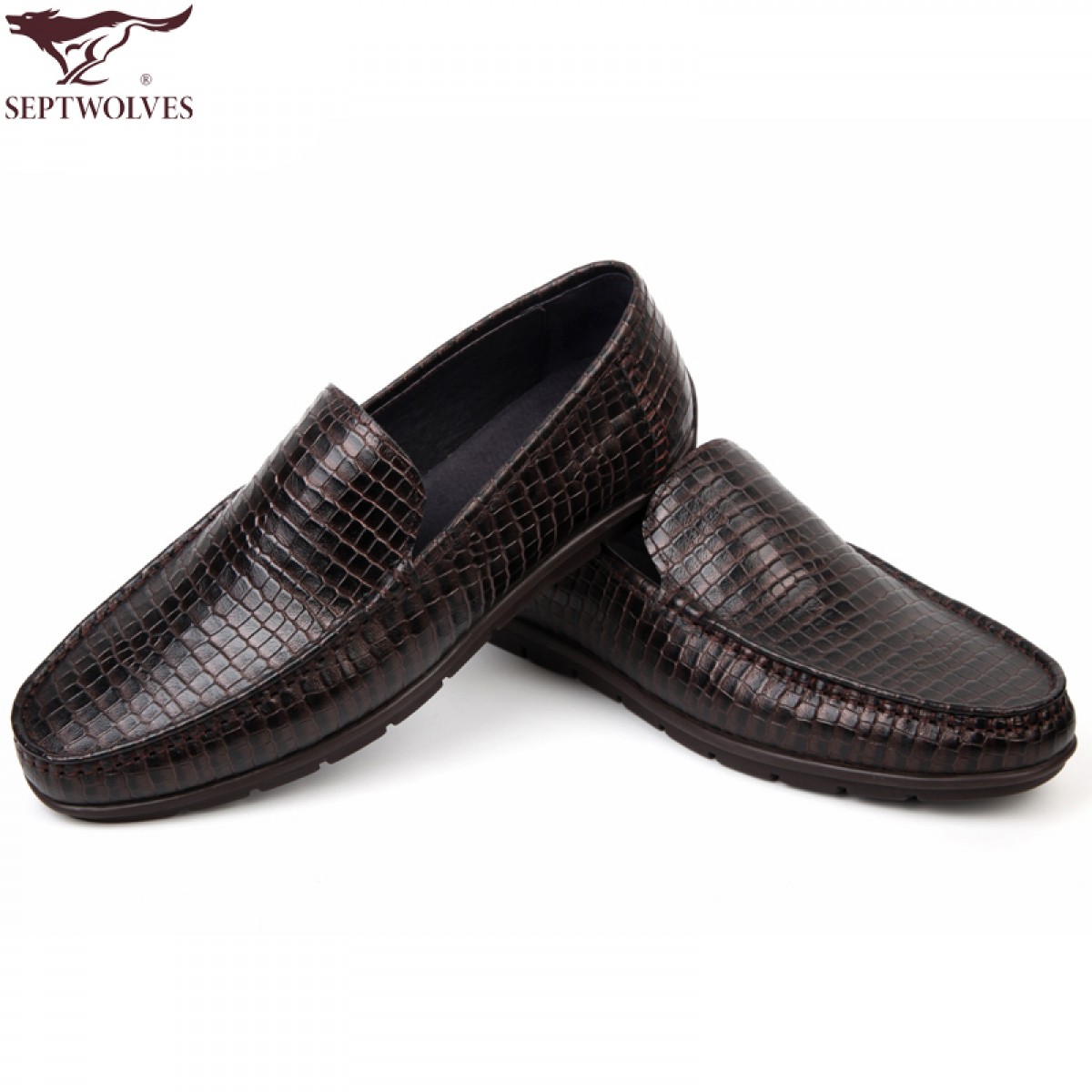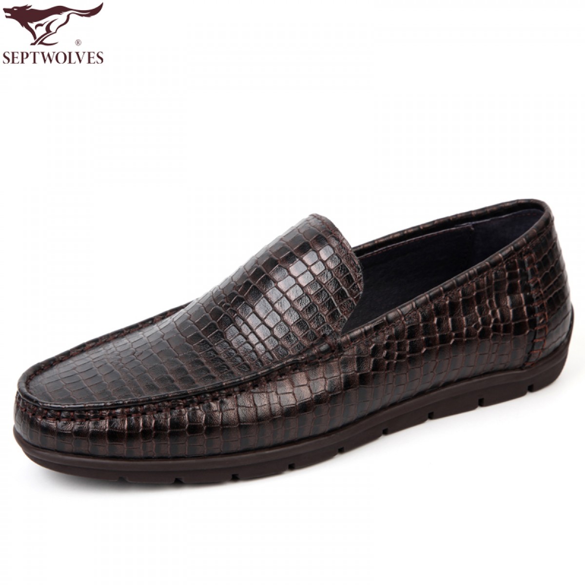 七匹狼 男鞋压花格纹头层牛皮男士套脚时尚商务休闲 舒适耐磨