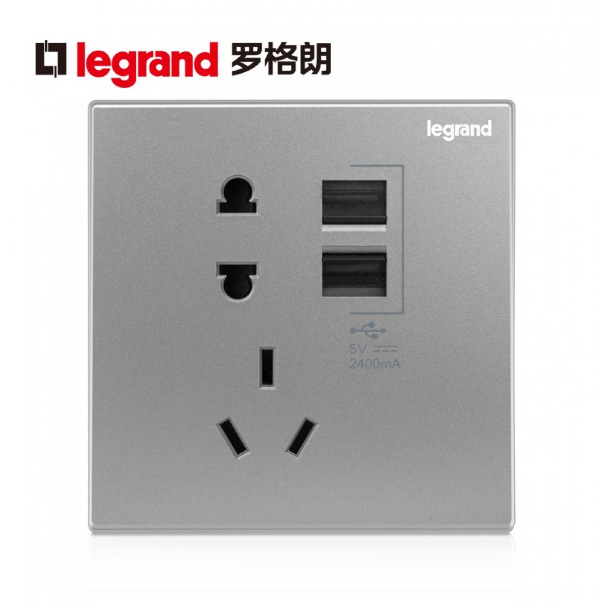 罗格朗 逸景深砂银五孔带USB开关插座面板灰色充电双口家用逸景