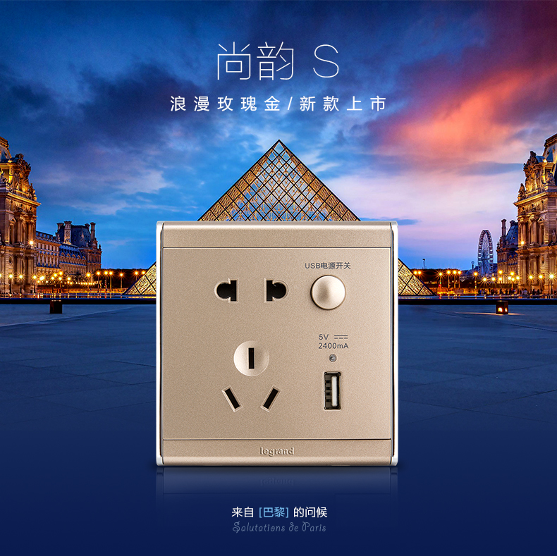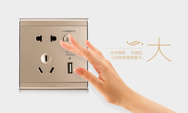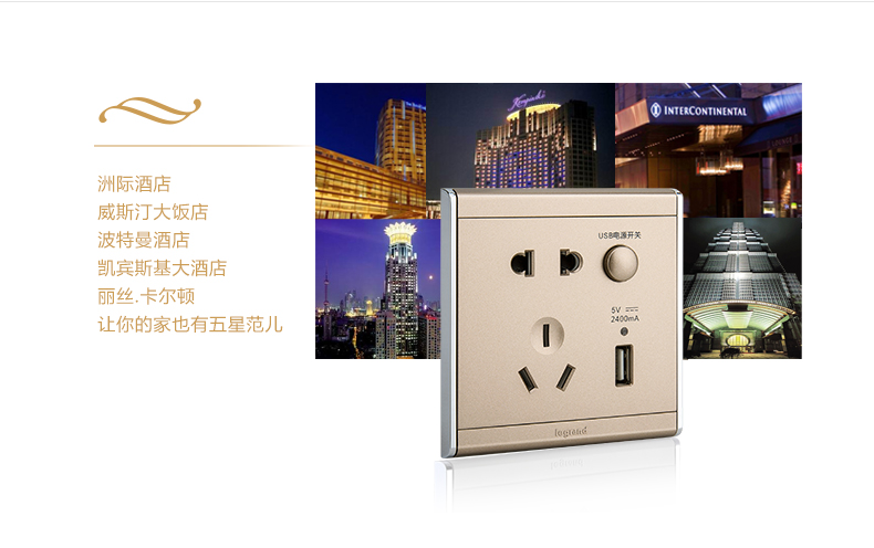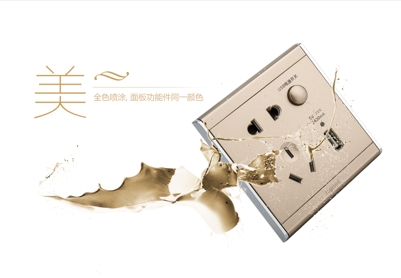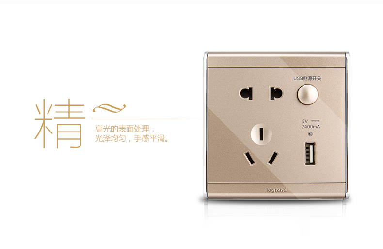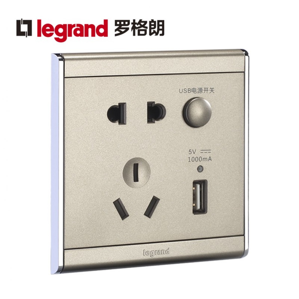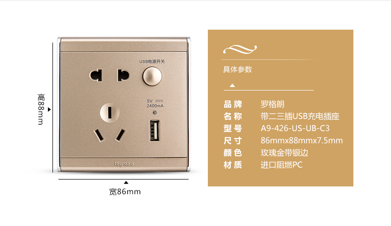 商品名称:罗格朗 A9缎沙金五孔带USB开关插座面板86型墙壁充电双口家用 HE25/10USL-C2