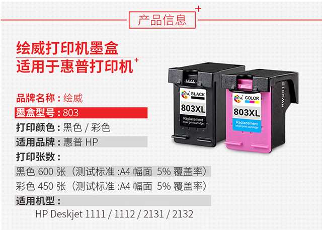 商品名称:绘威 803XL 彩色+黑色墨盒套装 HP1111 1112 2130大容量2131墨水HP2132
