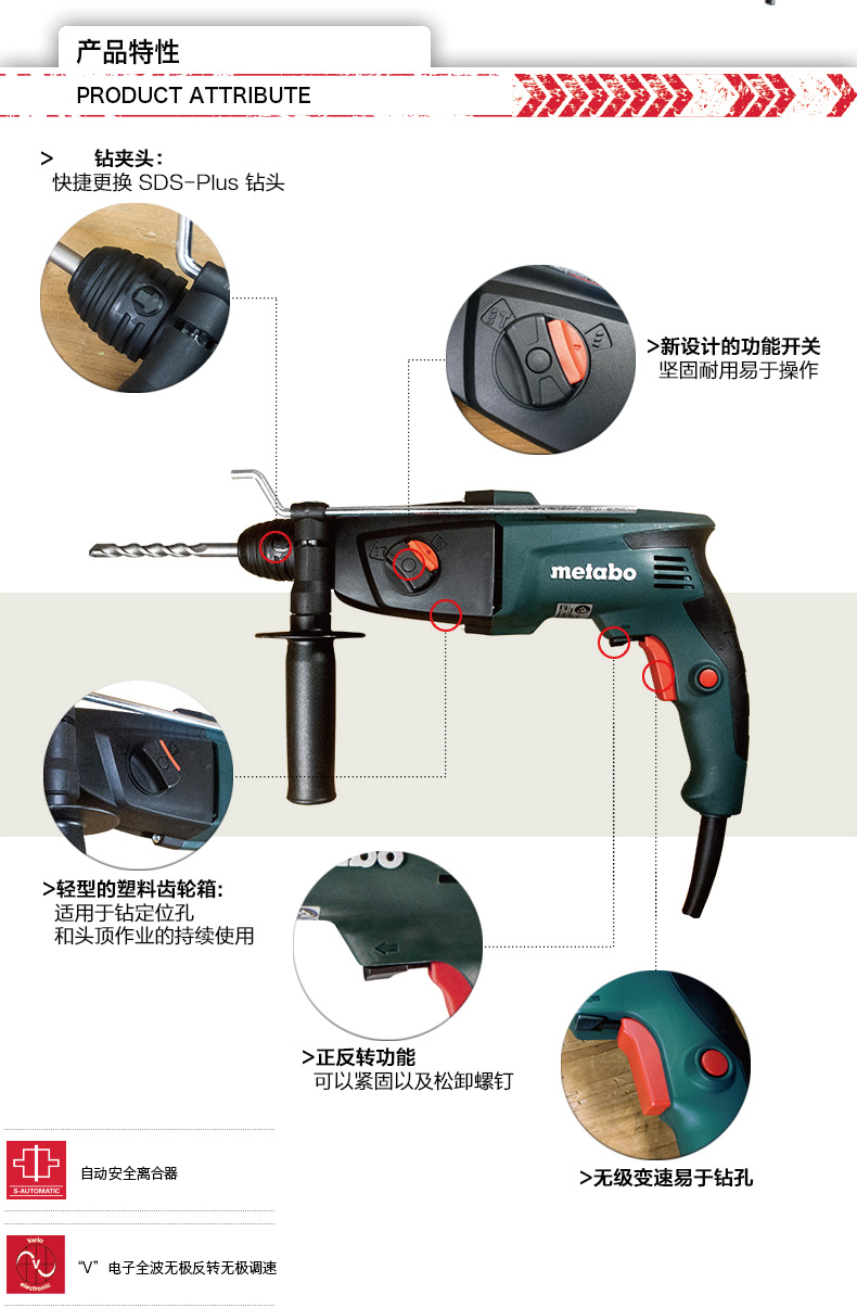 商品名称:Metabo/麦太保 冲击钻电锤两用家用正反调速 BHE2442