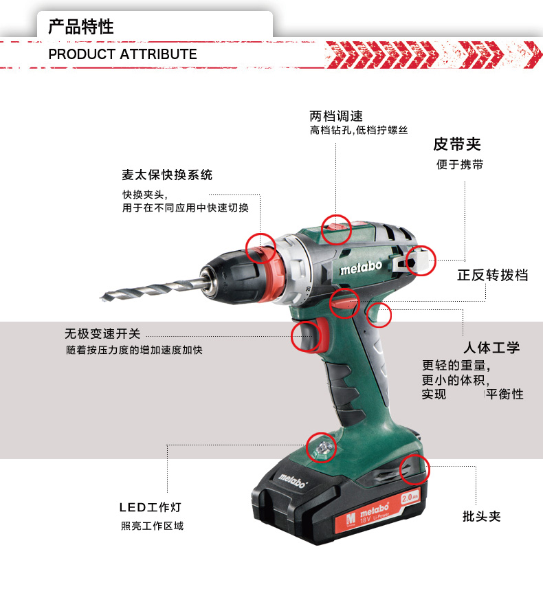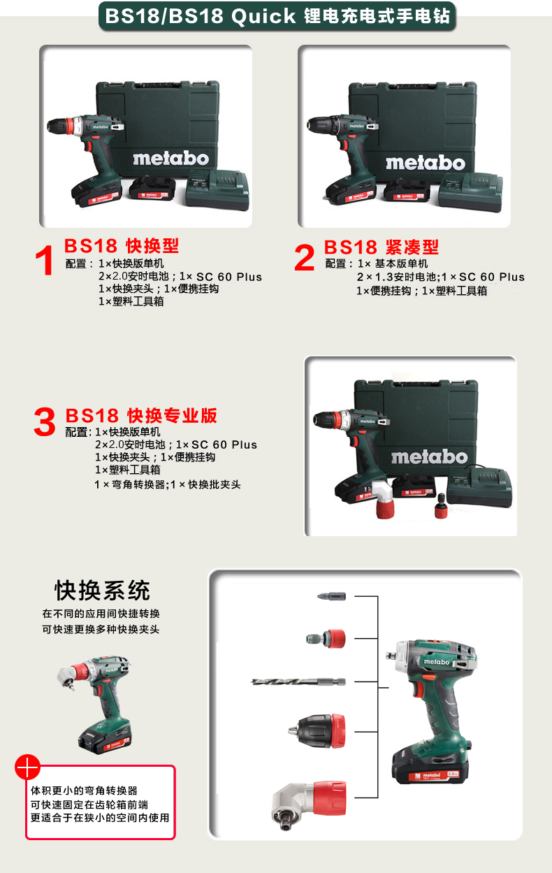 商品名称:Metabo/麦太保 锂电充电式手电钻螺丝批18V快换夹头 BS18Quick