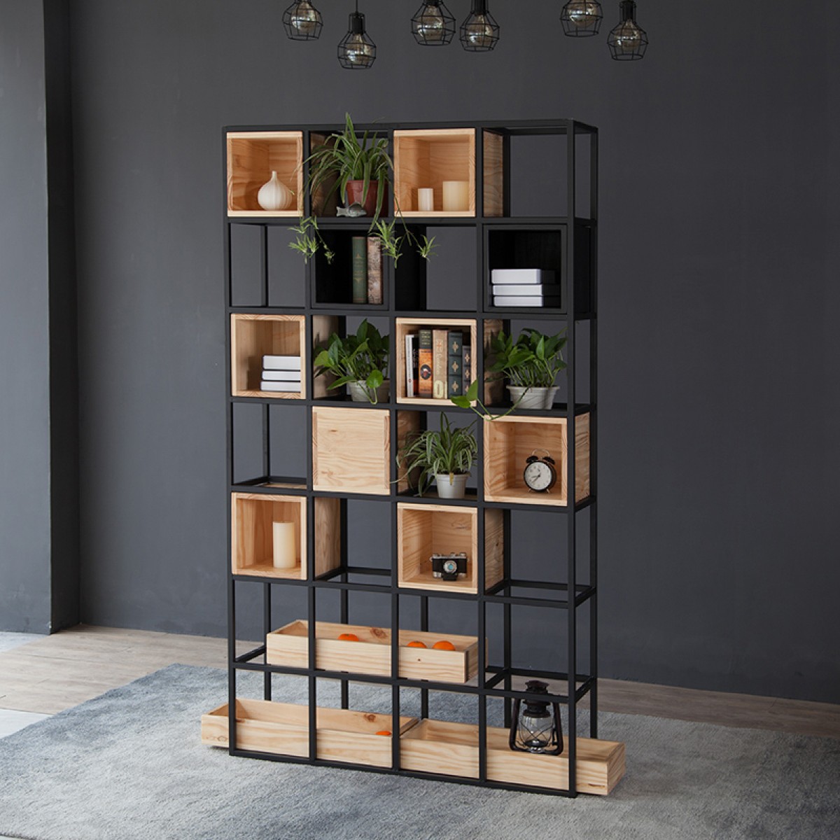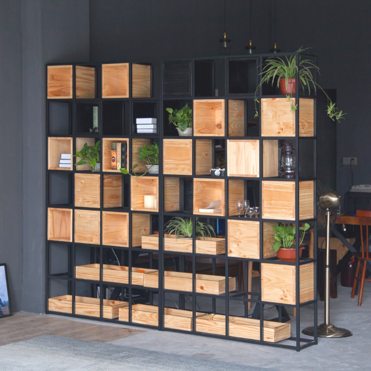 国产 铁艺实木书架置物架落地多层创意格子架客厅隔断屏风美式复古