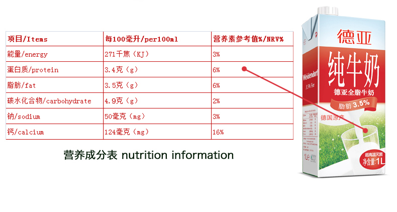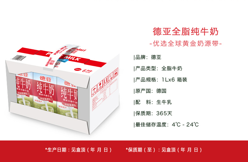 商品名称:德亚 全脂牛奶 1L*6/箱装