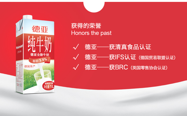 德亚 全脂牛奶 1L*6/箱装