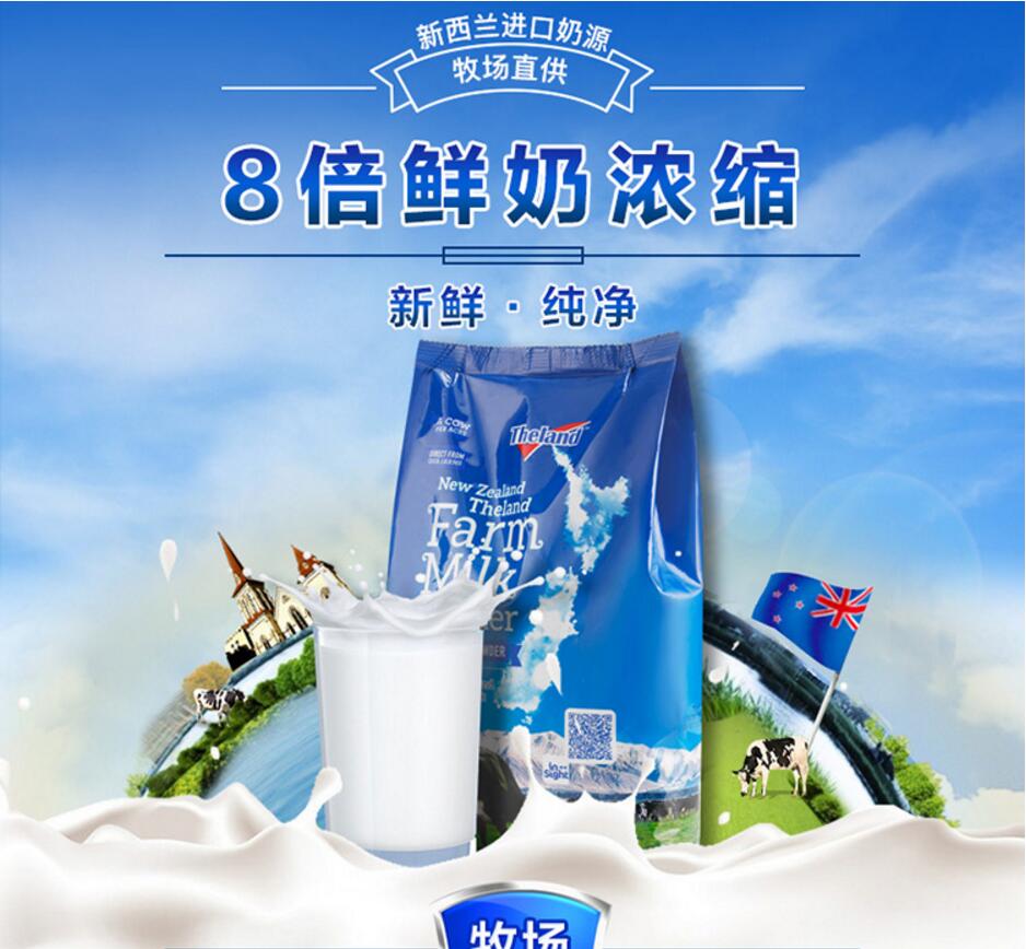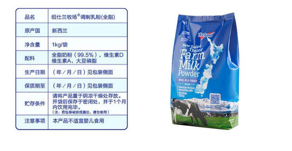 商品名称:纽仕兰/the land 成人全脂奶粉 1kg袋装1000g 调制乳粉