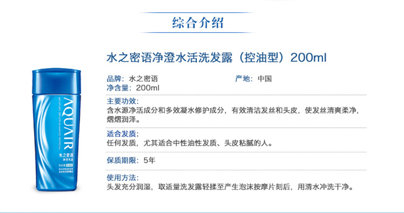 商品名称:资生堂 水之密语净澄水活洗发露控油型 200ml 控油洗发水